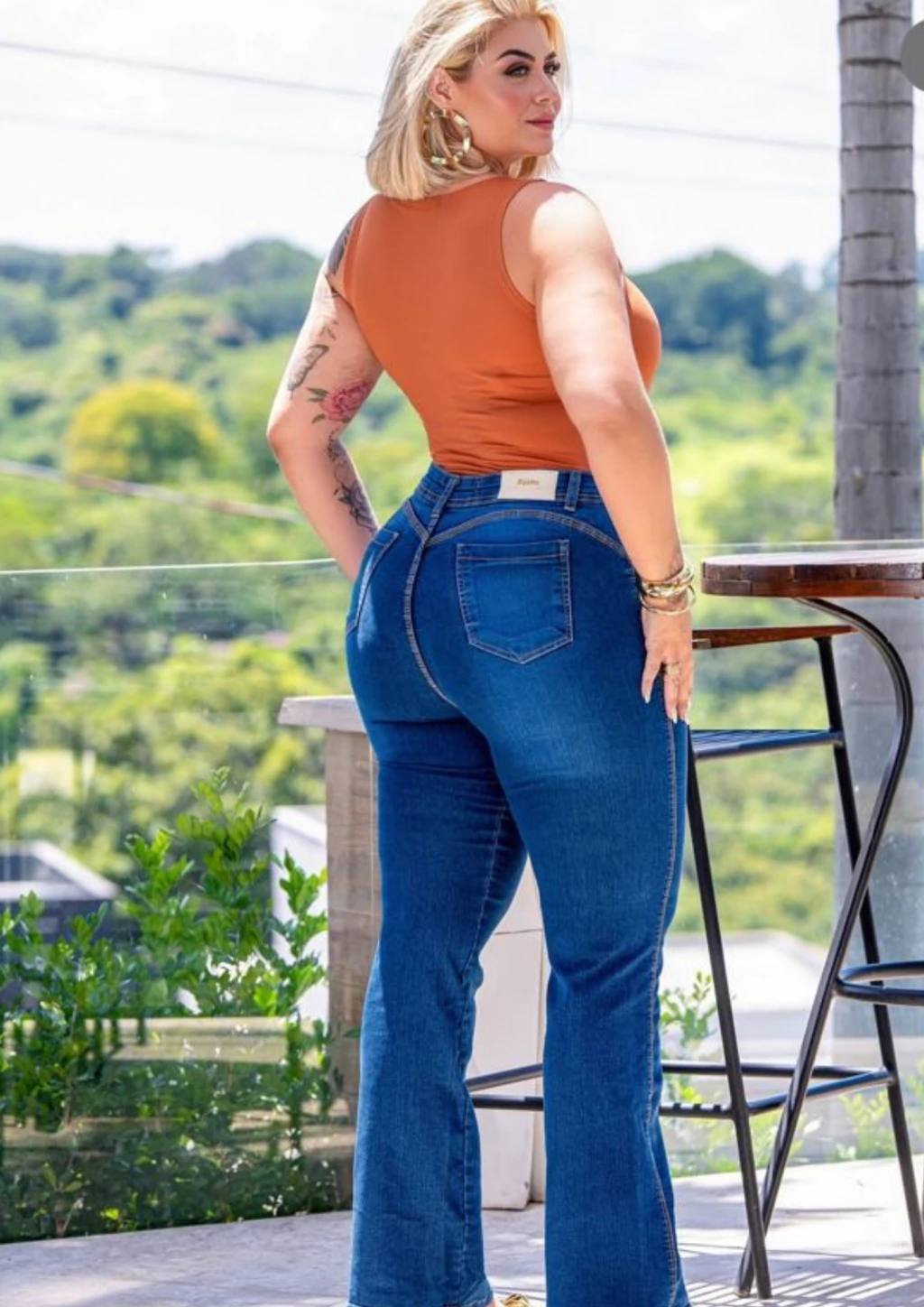 Calça confeccionada em jeans com lycra, modelagem flare, bolsos de trás verdadeiros, costura e acabamento em tom contrastando com o tecido, cós om 1 botão dourado, zíper e passantes, lavagem escura marmorizada.