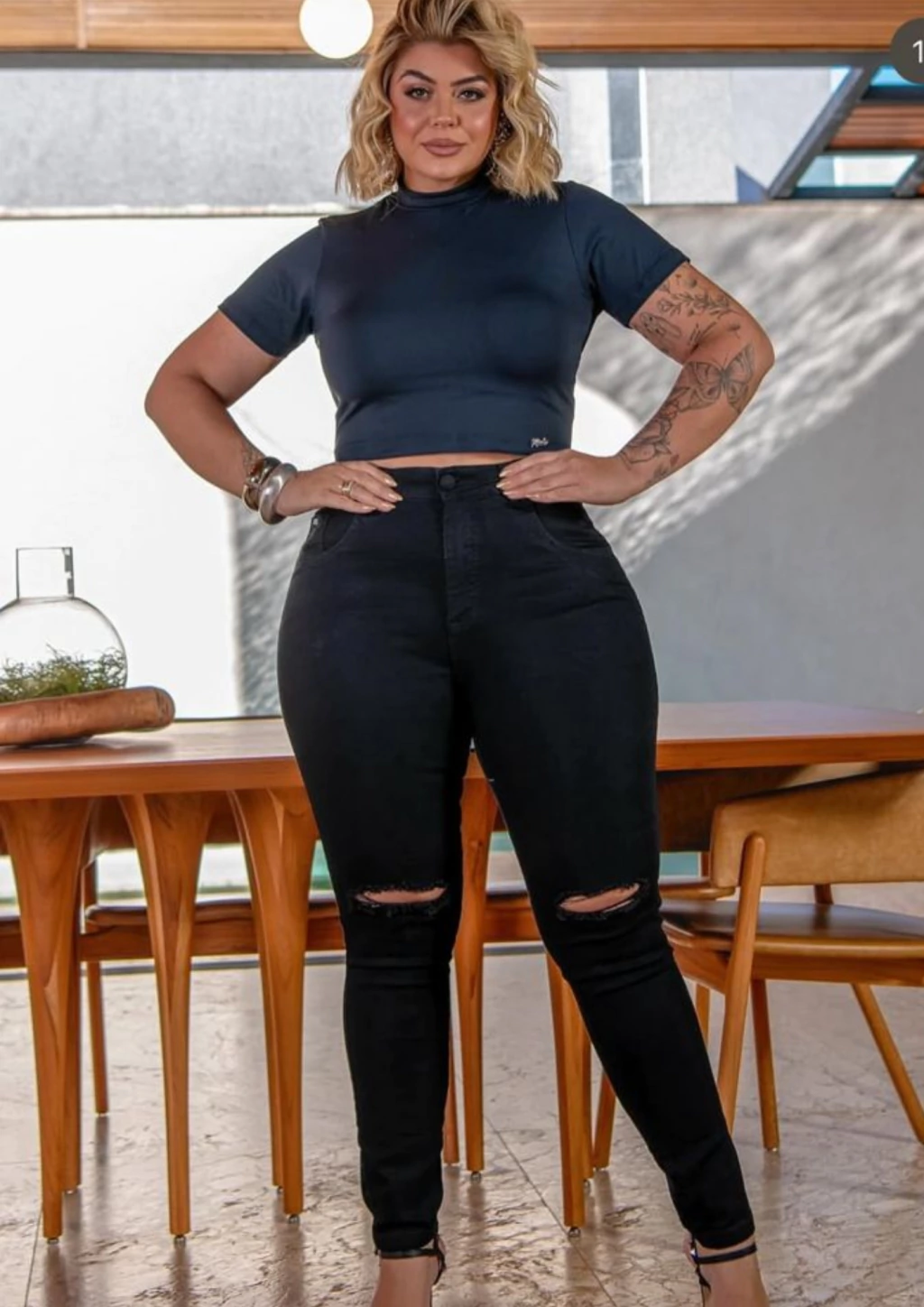 Calça Jeans Feminina Plus Size Preta com Elastano Destroyed