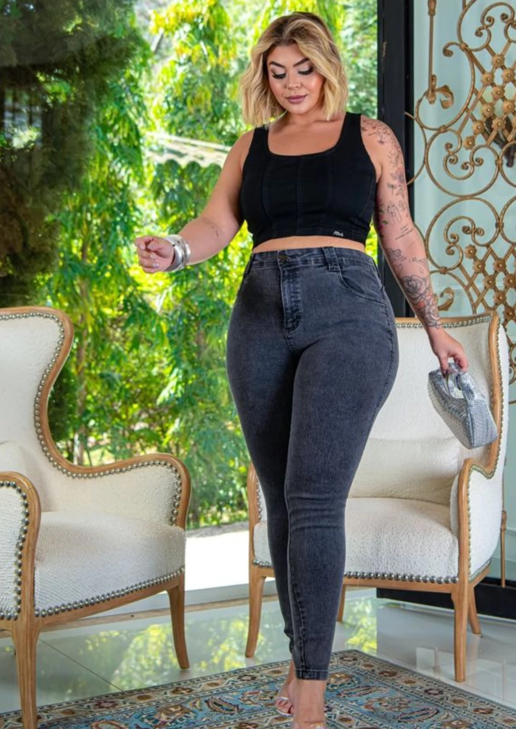 Calça jeans feminina plus size grafite, modelagem skinny que veste super bem e valoriza o corpo. Tem bolsos de verdade na frente e atrás, cós com passantes, botão e zíper. Feita com jeans com elastano, é confortável e perfeita pra usar no dia a dia com blusinhas, croppeds ou até camisa jeans pra um look todo estiloso.