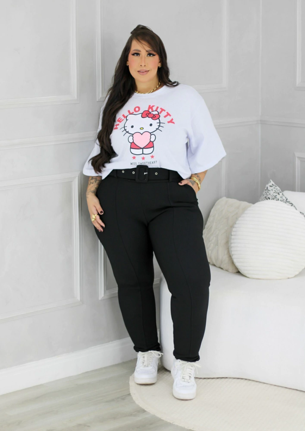 Calça feminina plus size confeccionada em tecido pop, com modelagem skinny que valoriza as curvas e garante caimento moderno. Na cor preta, acompanha cinto que acrescenta sofisticação e praticidade ao look. Versátil e elegante, é a peça curinga que transita facilmente entre produções casuais e sociais.