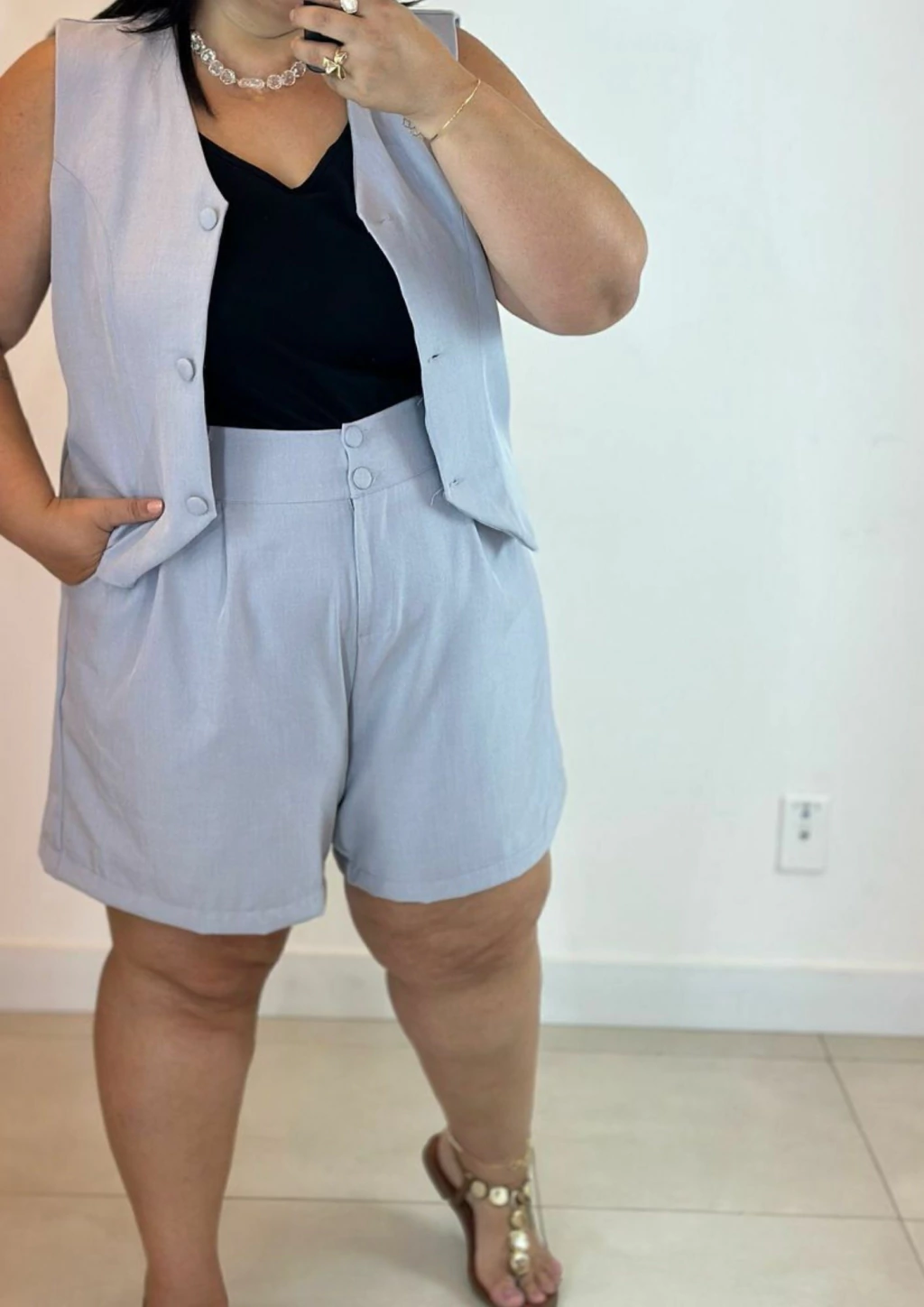 Conjunto confeccionado em tecido alfaiataria, composto por shorts e colete:
