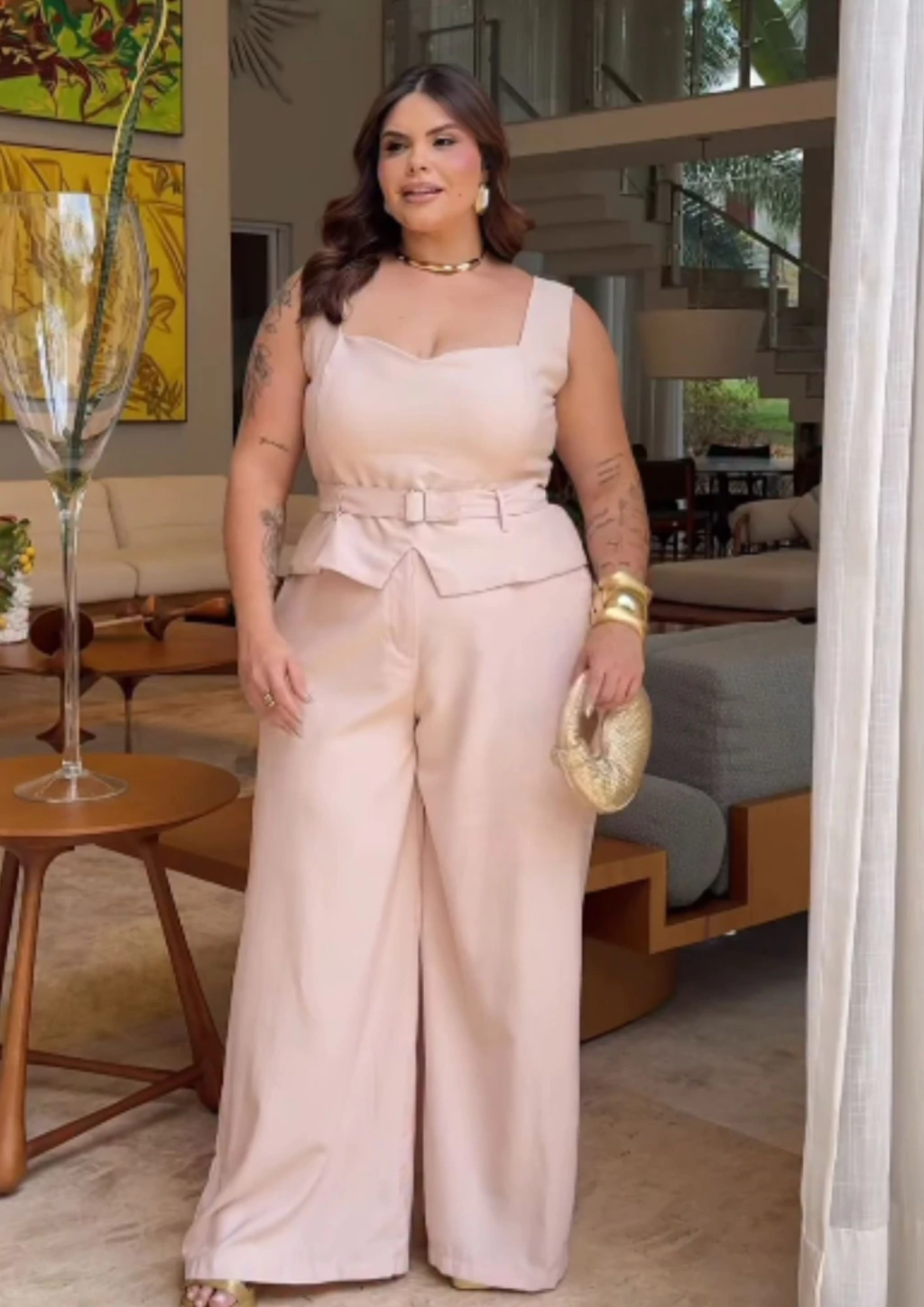 Conjunto em alfaiataria composto por blusa com alças médias e bojo, que garante sustentação e caimento elegante. A blusa acompanha cinto no mesmo tecido e tira nas costas com regulagem, proporcionando ajuste perfeito e conforto. A calça pantalona possui elástico duplo na parte de trás, garantindo flexibilidade e modelagem sofisticada, além de um caimento fluido e moderno. Um conjunto versátil, elegante e cheio de estilo, ideal para diversas ocasiões.