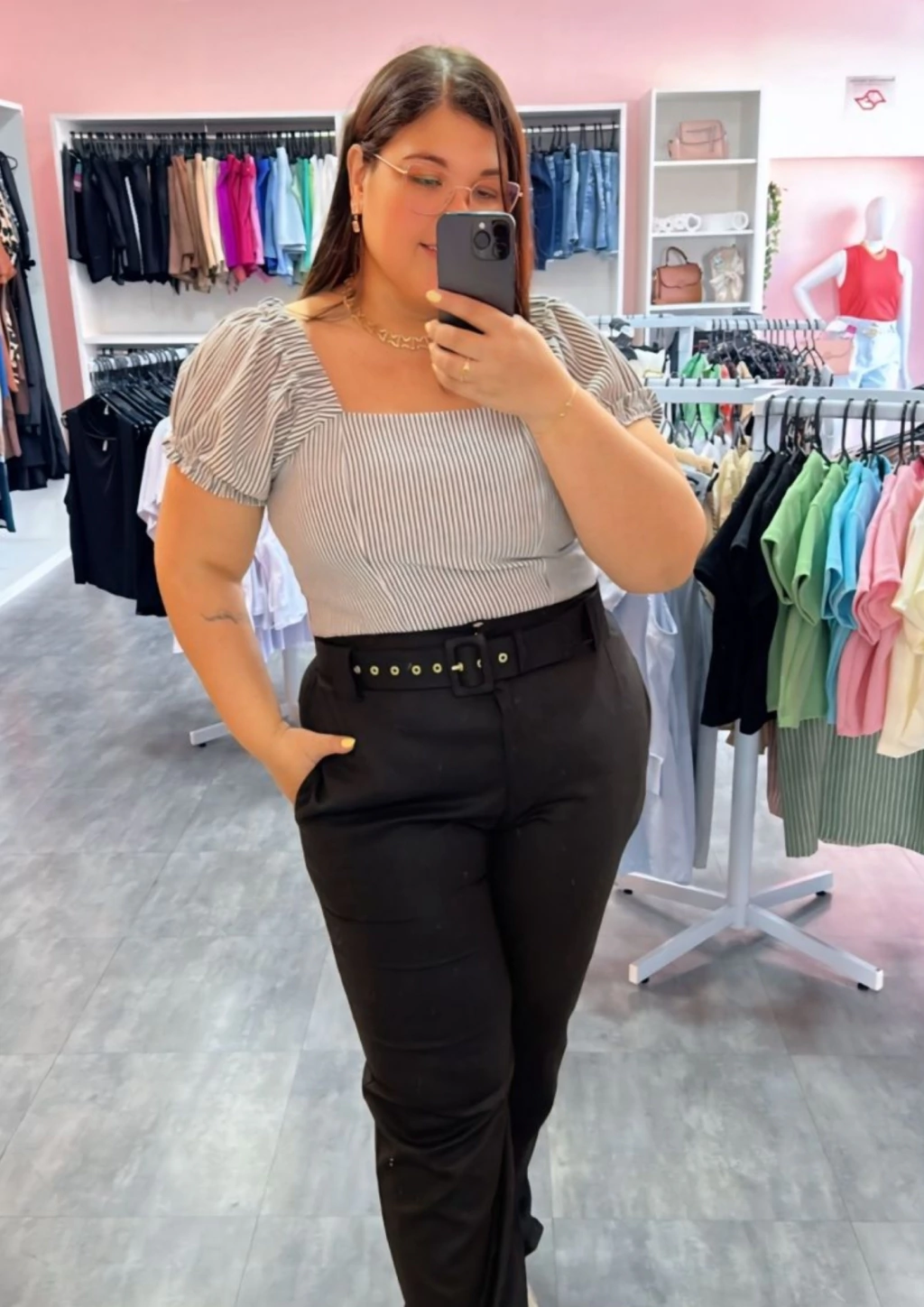 · Combine com peças de cintura alta: Saias, calças ou shorts de cintura alta ajudam a equilibrar o cropped e alongar a silhueta.