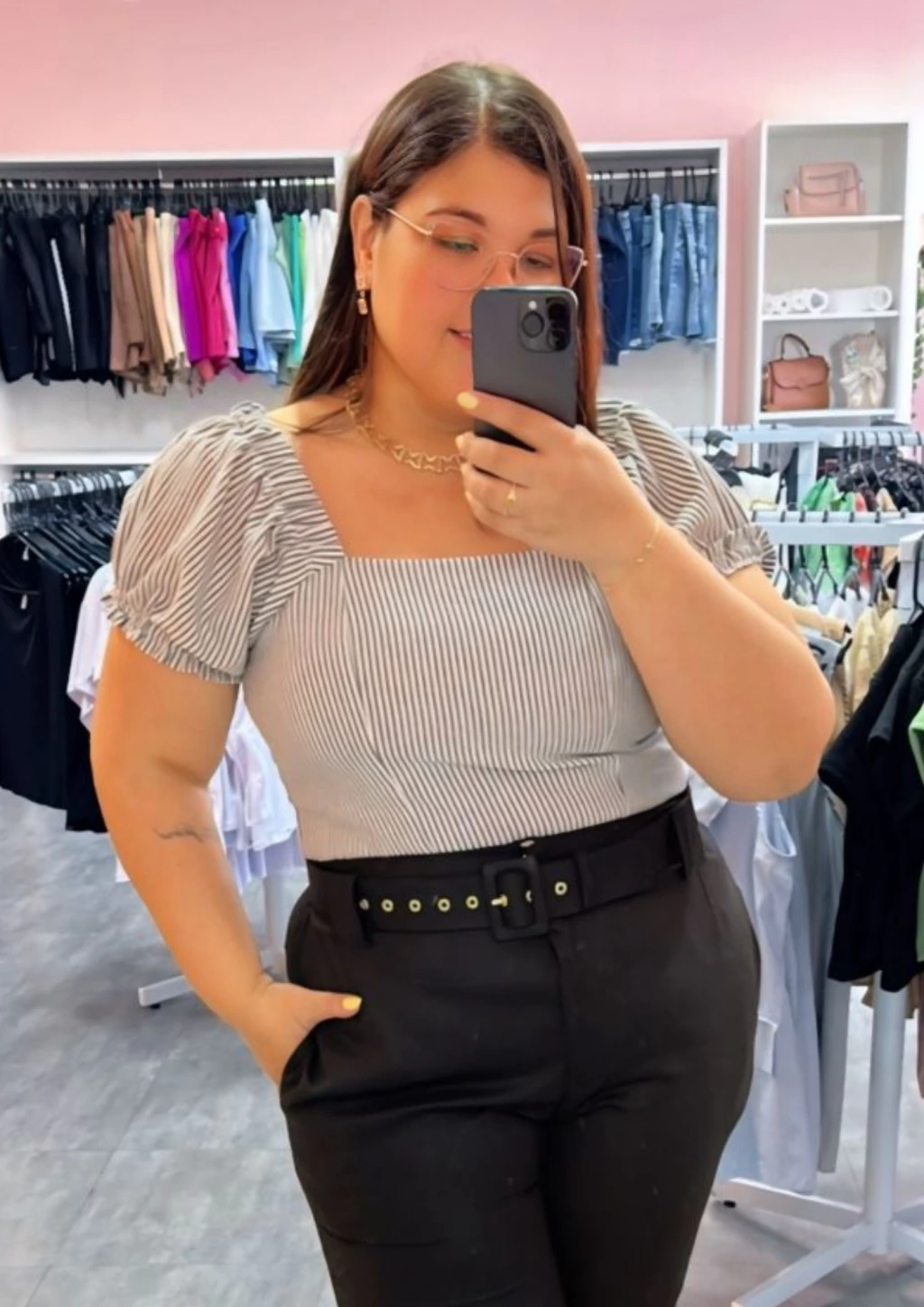 Este cropped plus size é a escolha perfeita para compor looks modernos com um toque elegante. Confeccionado em tecido com estampa risca de giz, traz sofisticação mesmo nas combinações mais casuais. A modelagem ombro a ombro valoriza o colo e garante um visual charmoso, enquanto o lastex nas costas proporciona conforto e ajuste ao corpo. As mangas curtas com elástico no punho criam um leve efeito bufante, deixando a peça ainda mais estilosa.