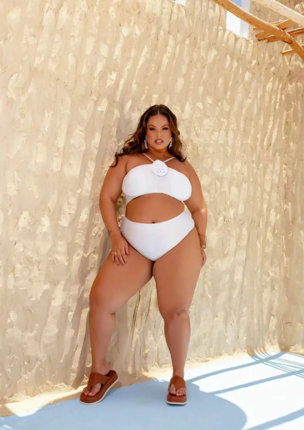 Maio confeccionado em malha lycra beach Gloss com proteção UV50+ com forro em microfibra de poliamida, maiô com amarração no pescoço ou na própra peças nas cosas, com bojos impermiáveis e removíveis, broche com desenho de flor no mesmo tecido removível.