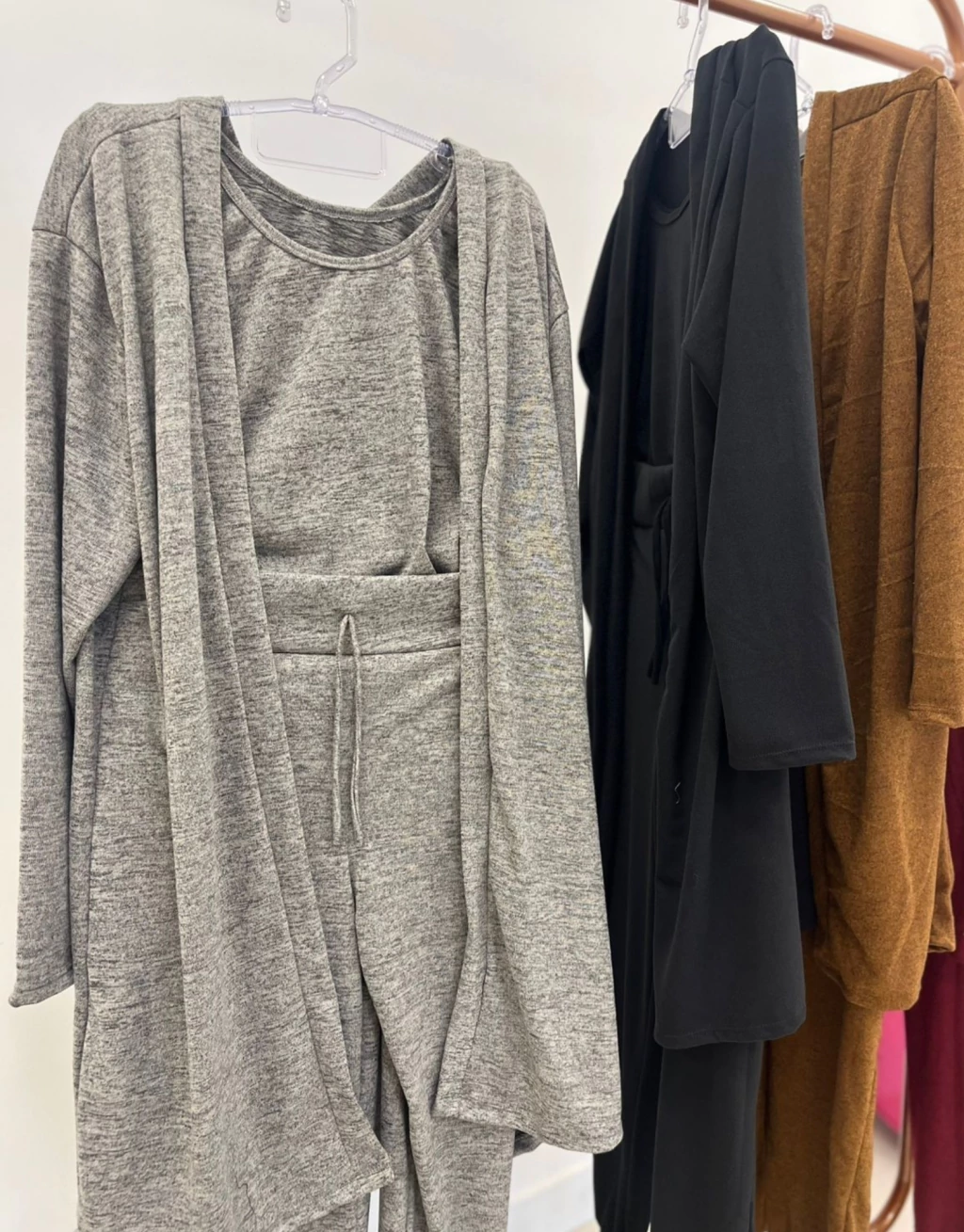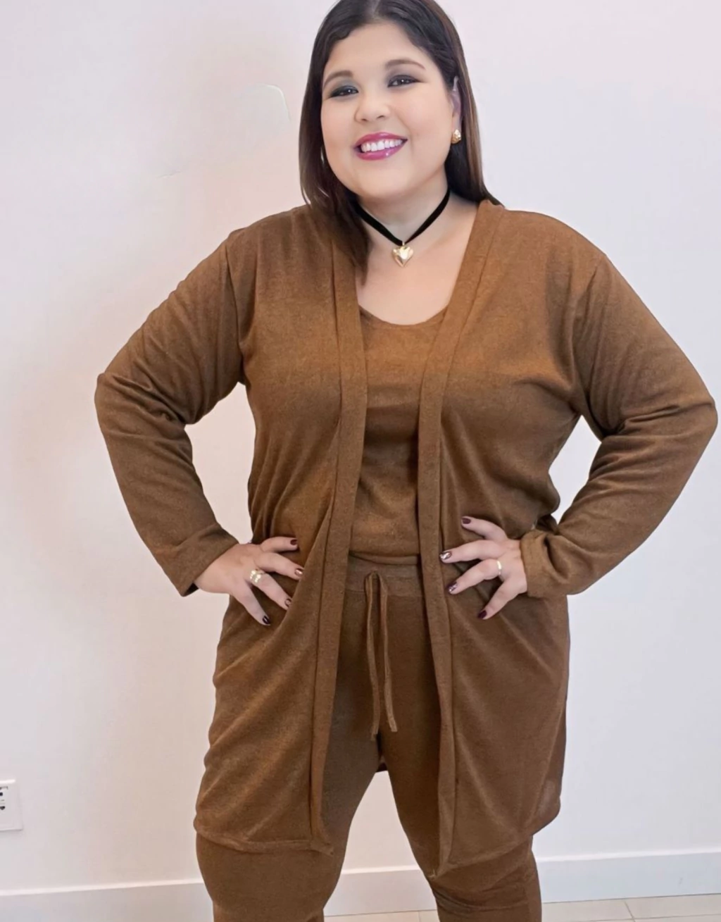 Trijunto confeccionado em tecido lanzinha, que tem sua base no poliéste com elastano, composto por cardigan, calça e regata: