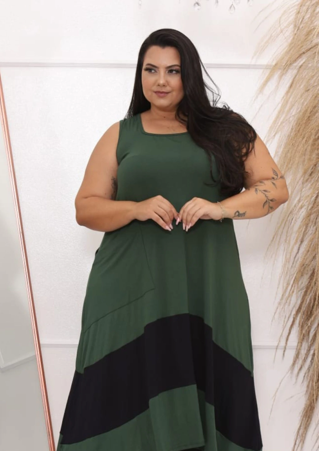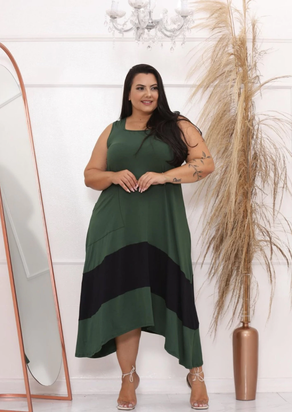 O equilíbrio entre praticidade e estilo está neste vestido midi de malha regata com bolso bicolor, uma peça versátil e cheia de personalidade para quem ama se vestir bem sem abrir mão do conforto.
