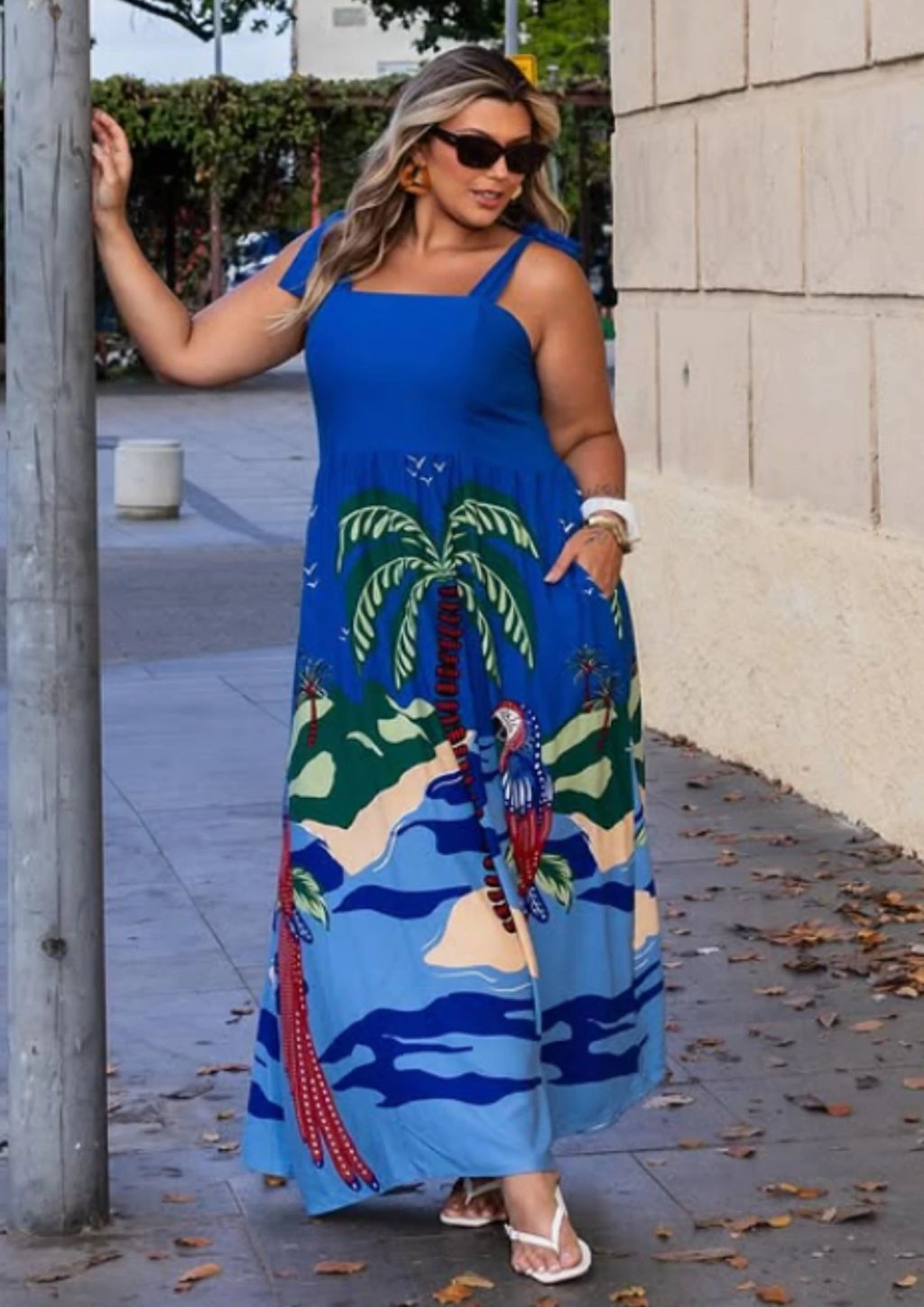Vestido longo plus size com alças finas de amarrar, que permitem ajuste perfeito e um toque delicado ao visual. Possui lastex nas costas, garantindo conforto e caimento ideal, além de bolsos funcionais, que trazem praticidade e estilo. Confeccionado em tecido leve com estampa vibrante estilo Farm, é uma peça moderna, alegre e cheia de personalidade — perfeita para dias de sol e momentos descontraídos.
