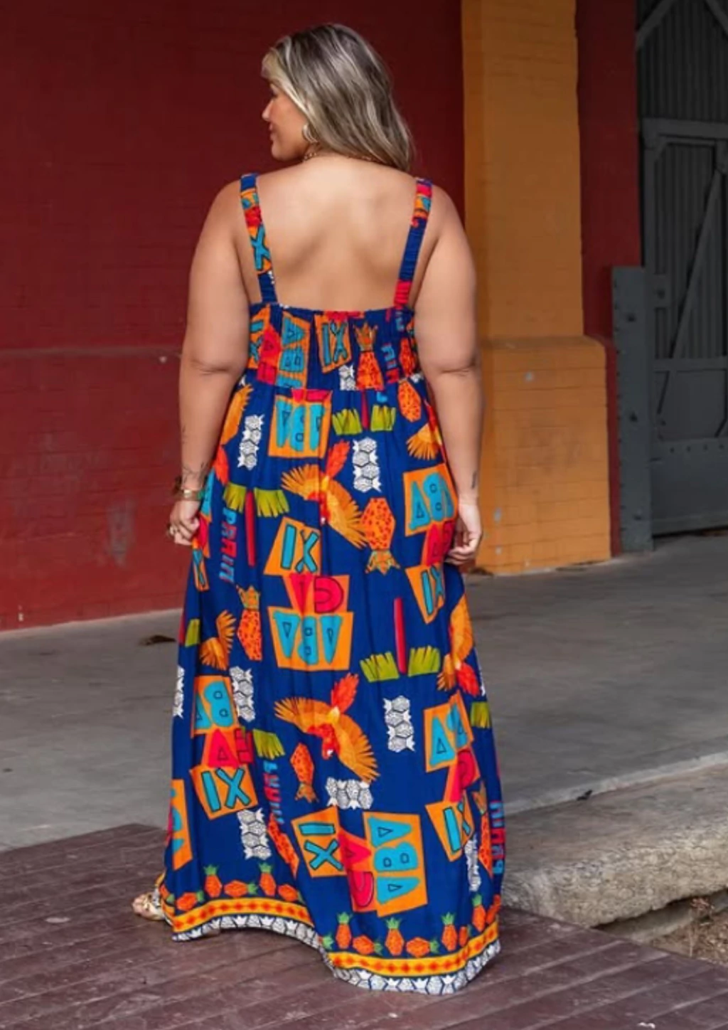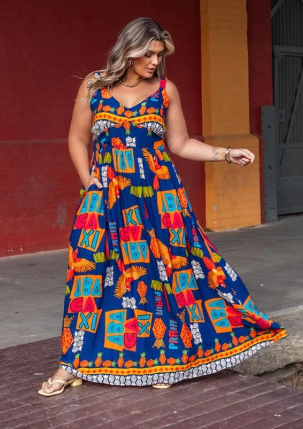 Vestido longo plus size confeccionado em tecido leve com estampa estilo Farm, vibrante e cheia de personalidade. Possui alças finas com elástico para melhor ajuste e lastex nas costas, que proporciona conforto e caimento perfeito. Conta ainda com bolsos funcionais, práticos e modernos, que deixam o visual ainda mais despojado. Uma peça fresca, colorida e superestilosa — perfeita para quem busca elegância com conforto.