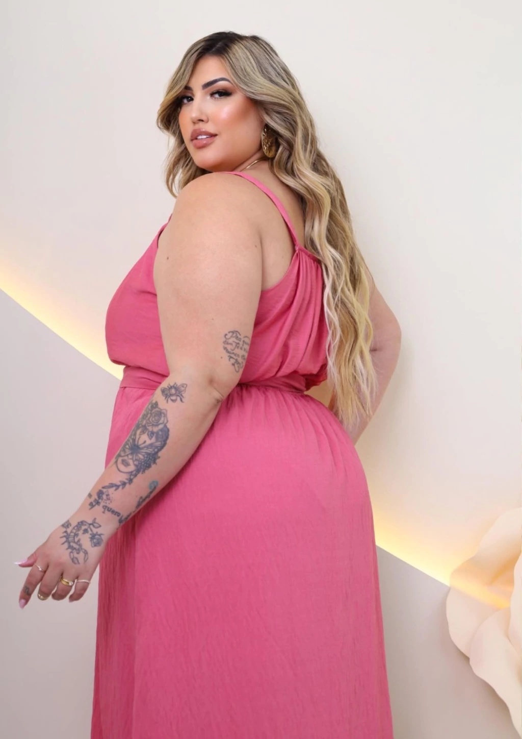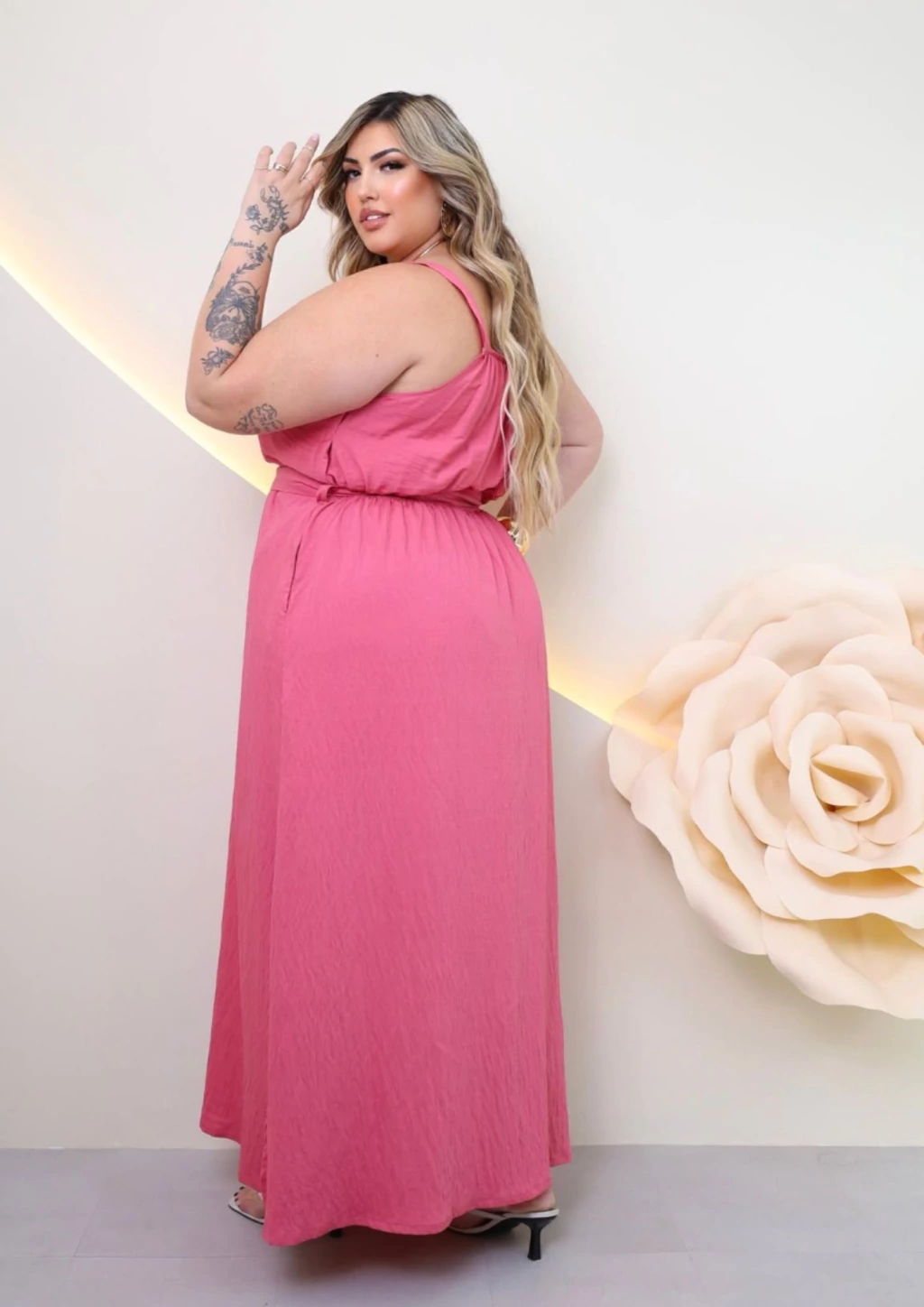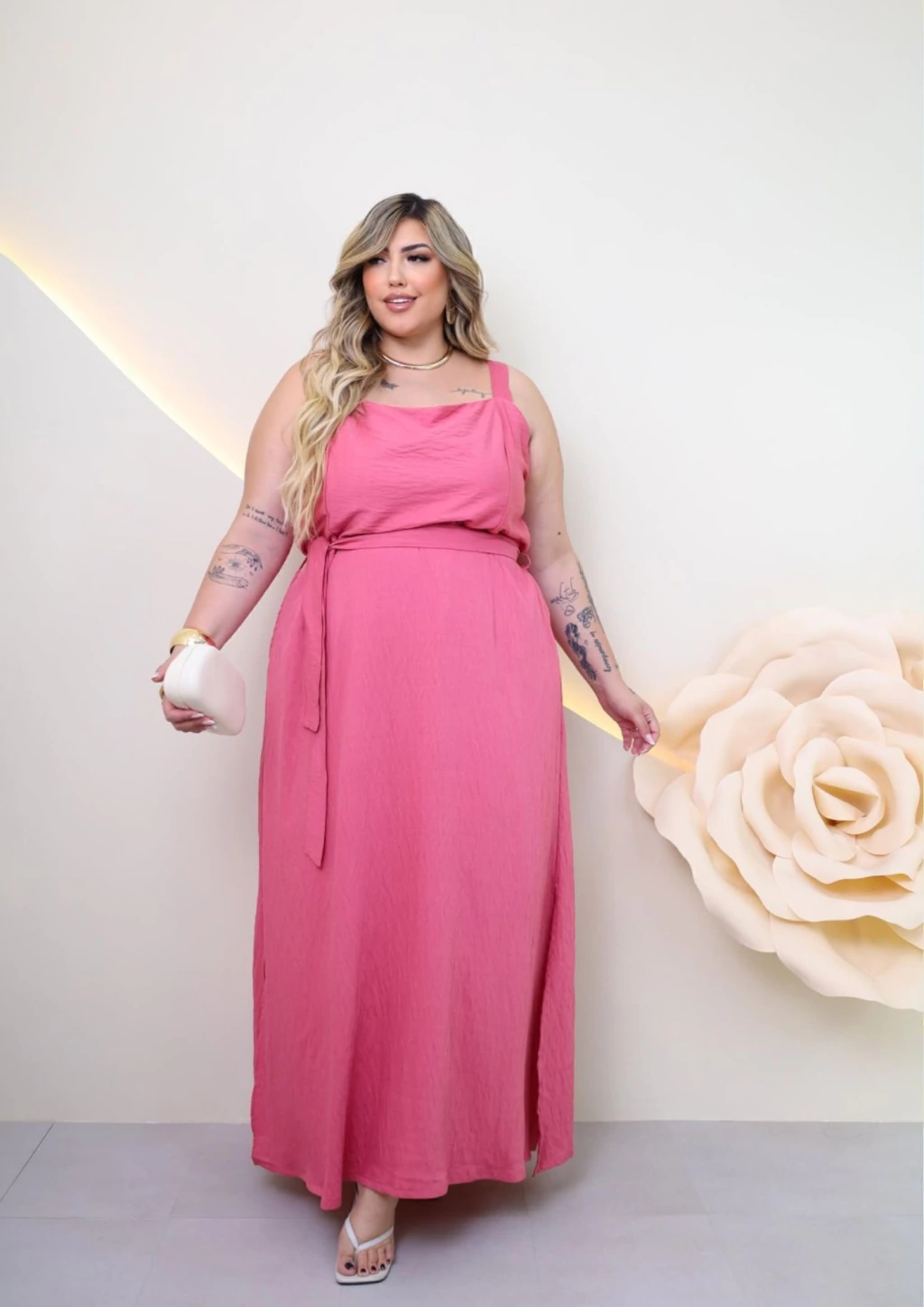 Feito em tecido fresco e fluido, ele é perfeito para dias quentes ou produções cheias de movimento. A fenda lateral traz um toque de sensualidade sutil e liberdade ao caminhar, enquanto a amarração na cintura permite ajustar o caimento, destacando a silhueta de forma delicada e moderna.